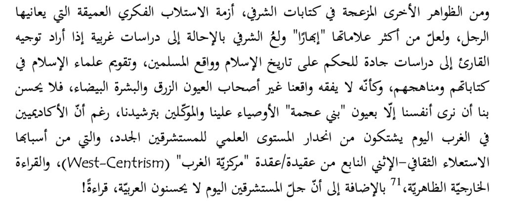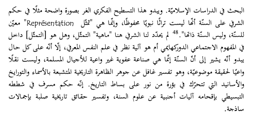 ” التخبط المنهجي للشرفي يتجلّى أيضا في الاستلهام الاستسلامي من علم النفس وعلم الاجتماع، أصوَل النظر والتحليل دون استيعاب لقصور هذه المناهج وعدم ملائمة أدواتها ومقولاتها لميدان البحث في الدراسات الإسلاميّة. ويبدو هذا التسطيح الفكري الغر بصورة واضحة مثًلا في حكم الشرفي على السنّة أنها ليست تراثًا نبويًا محفوظًا، وإّنما هي “تمثّل Représentation” معّين للسنّة، وليس السنّة ذاتها”.48 لم يحّدد لنا الشرفي هنا “ماهية” التمثّل، وهل هو (التمثّل) داخل في المفهوم الاجتماعي الدوركهايمي أم هو آلية نظر في علم النفس المعرفي، إّلا أنّه على كل حال يبدو أنّه يشير إلى أّن السّنة إّنما هي صناعة عفوية غير واعية للأجيال المسلمة، وليست نقًلا واعًيا لحقيقة موضوعّية، وهو تفسير غافل عن جوهر الظاهرة التاريخية المتشبعة بالأسماء والتورايخ والأسانيد التي تتحّرك في بؤرة من نور على بساط التاريخ. إنّه حكم مسرف في شططه التبسيطي بإقحامه آليات أجنبية عن علوم السنة، وتفسير حقائق تاريخية صلبة بإجمالات ساذجة.”