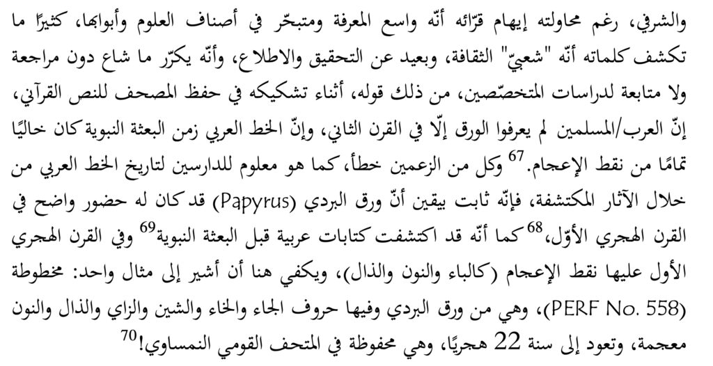 ٢- في صفحة ٣٦ – يورد معلومة جميلة أن الخط العربي كان معجماً ومنقوطاً وورق البردي كان حاضرا سنة ٢٢ هجرية !!
