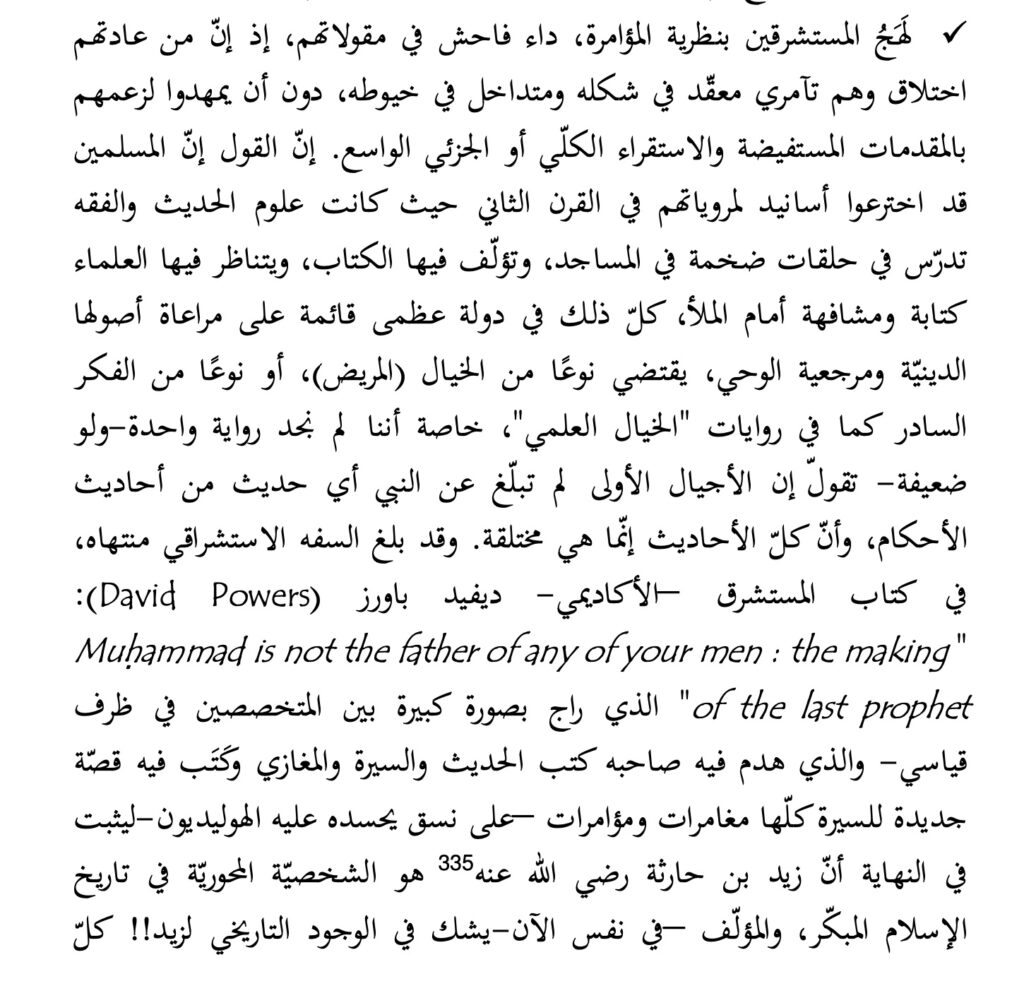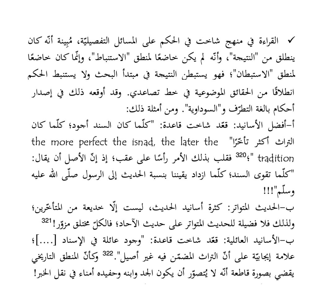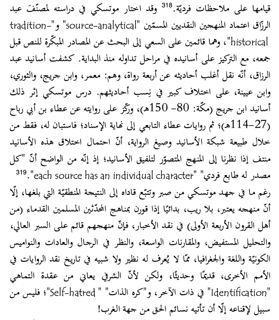 ٥- هنا يتكلم عن خلاصة وصلها موتسكي ( مستشرق ألماني معاصر ) بعد دراسته لمصنف عبدالرزاق باستحالة اختلاق الأحاديث وفق منهج شاخت ثم تعقيب جميل العامري حول منهج المحدثين الفعلي مقارنة بعمل موتسكي ..